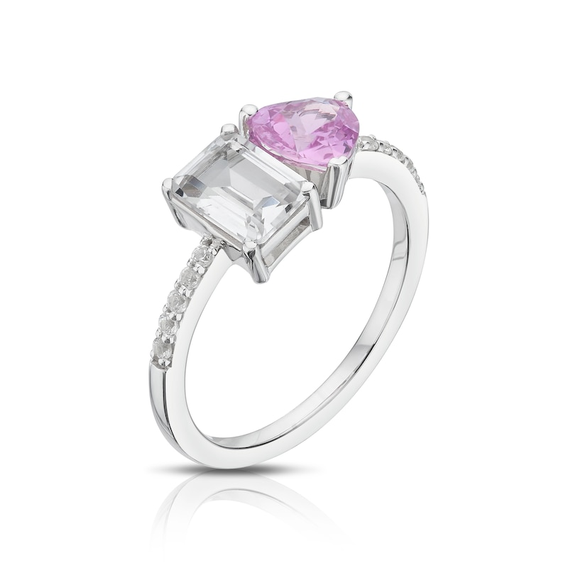 Sterling Silver Created White & Pink Sapphire Emerald Cut Heart Ring | H.Samuel